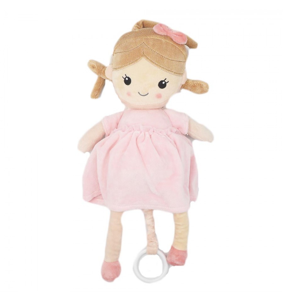 Muñeca sonajero ideal para la estimulación de bebés de 0 a 24 meses.Trae cordon para colocar en el coche o la cuna. Al momento de halar el bebé escuchará una canción de cuna. Color Rosado. Envios a nivel nacional.