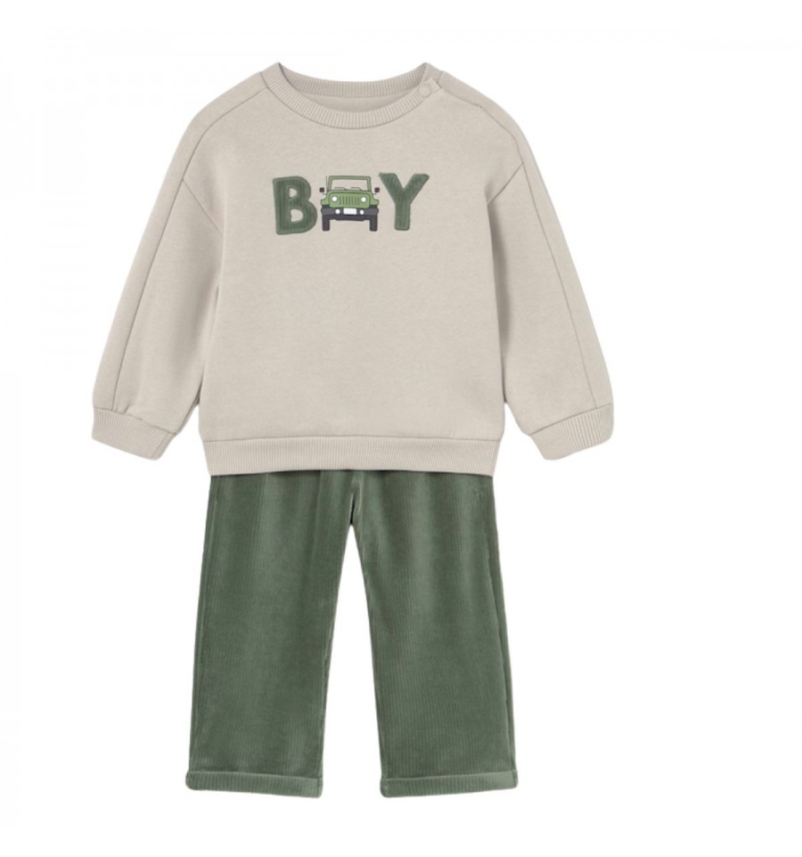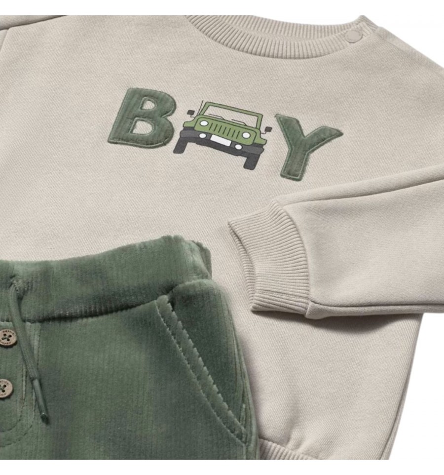 conjunto de manga larga para bebé. Cuello redondo. Botones a presión en el hombro para facilitar la puesta de la prenda. Elementos de adorno: aplique decorativo, serigrafía (print). Estampado con motivos del mundo del motor.