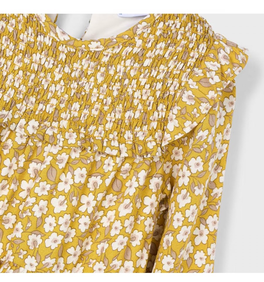 Vestido de manga larga para niña con volantes en los hombros. Cuello redondo. Cierre con un único botón. Tejido cálido ideal para los días más fríos. Este modelo lleva detalles de nido de abeja. Modelo con rizo. Diseño estampado.