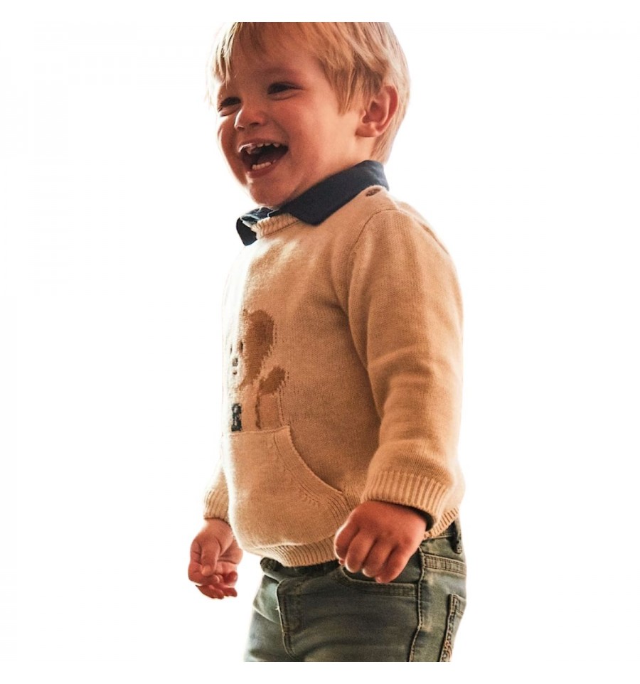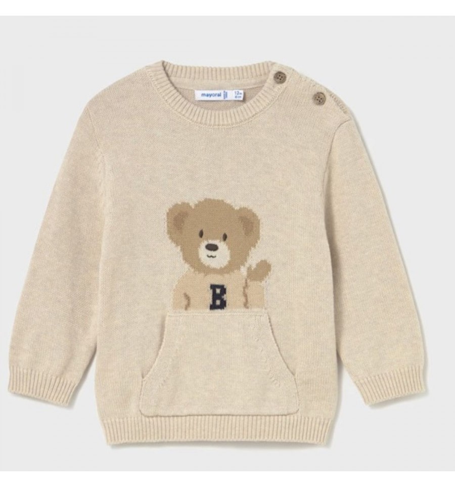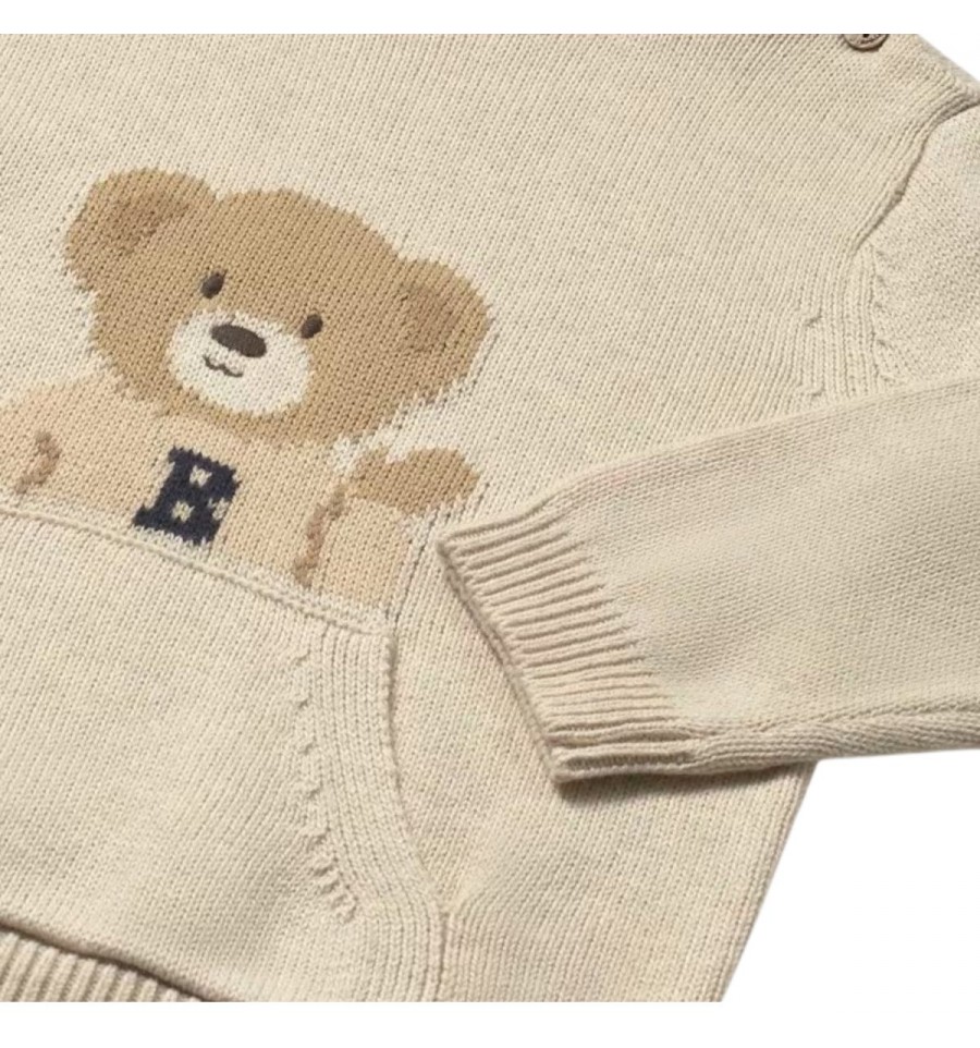 Jersey de manga larga para bebé. Cuello redondo. Botones en el hombro para facilitar la puesta. Bolsillo funcional en la parte delantera. Elementos de adorno: oso
