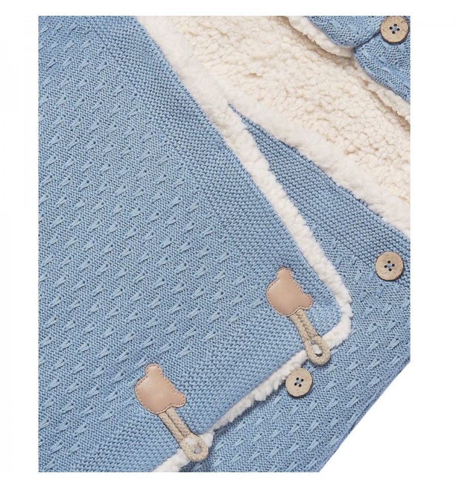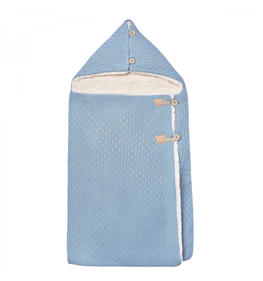 Agradable saco para capazo con diseño envolvente, de tacto suave y gustoso. Pensado para abrigar a bebés recién nacidos y adaptable a todo tipo de carros. Cierre lateral con botones. Tejido de punto tricotosa de tacto suave y agradable. Cuerpo interior forrado con pelo fino y suave.