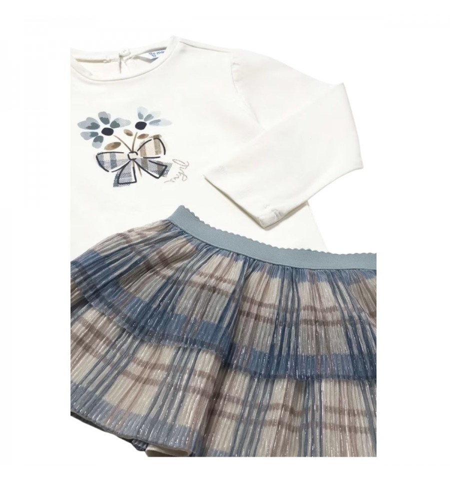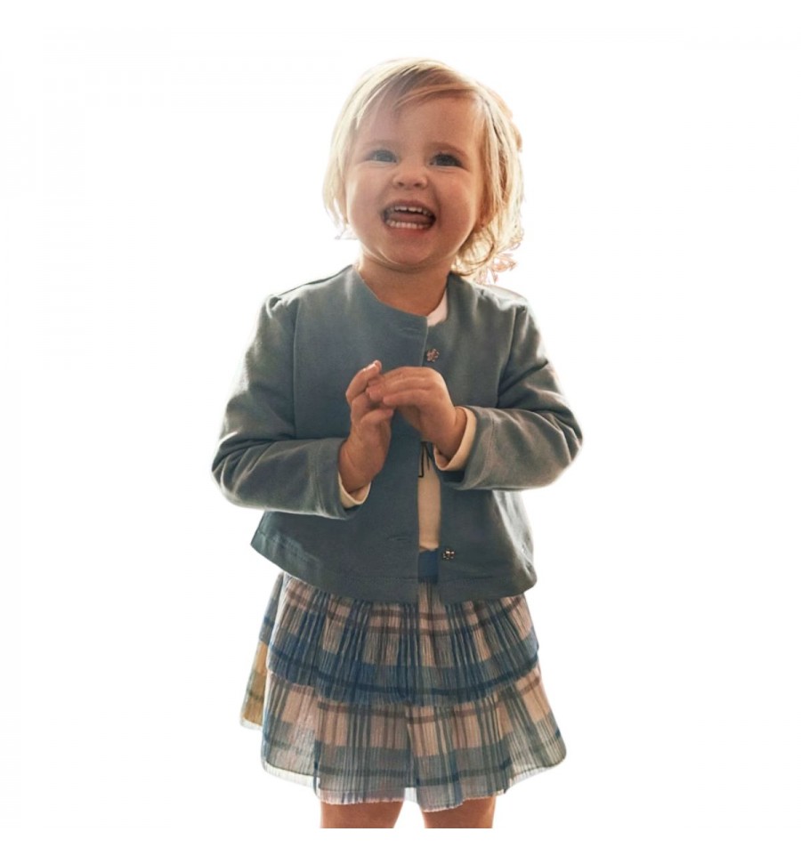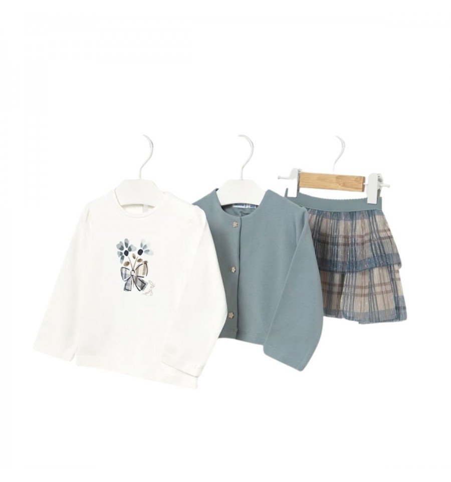 Conjunto de tres piezas para bebé compuesto por una rebeca, una camiseta y una falda combinadas.