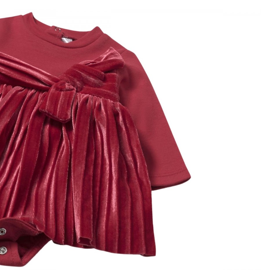 vestido manga larga para recién nacida. Cuello cisne. Cierre con botones a presión en la parte posterior. Botones a presión en la entrepierna para facilitar la puesta de la prenda. Confección combinada en distintos tejidos para conseguir un diseño único y especial.