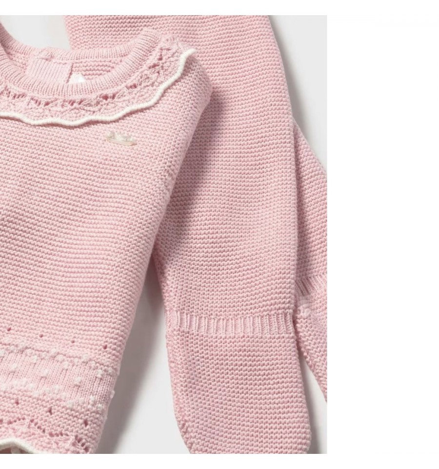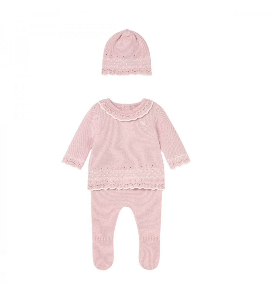 conjunto de tres piezas para recién nacida. Tejido de punto tricotosa de tacto suave y agradable.