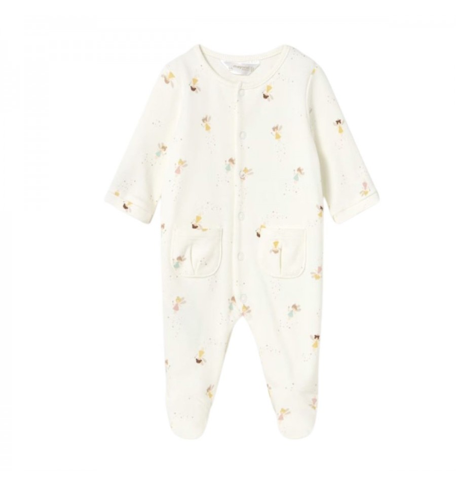 Pijama de manga larga para recién nacido. Cuello redondo. Cierre con botones a presión en la parte delantera. Botones a presión en la entrepierna para facilitar la puesta de la prenda.