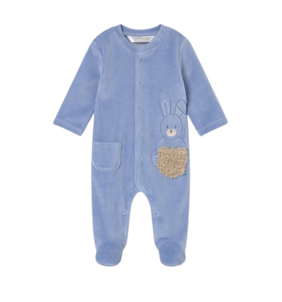 Pijama de manga larga para recién nacido. Cuello redondo. Cierre con botones a presión en la parte delantera. Botones a presión en la entrepierna para facilitar la puesta de la prenda. Cálido tejido de algodón con tacto suave y aterciopelado. Elementos de adorno: bordados