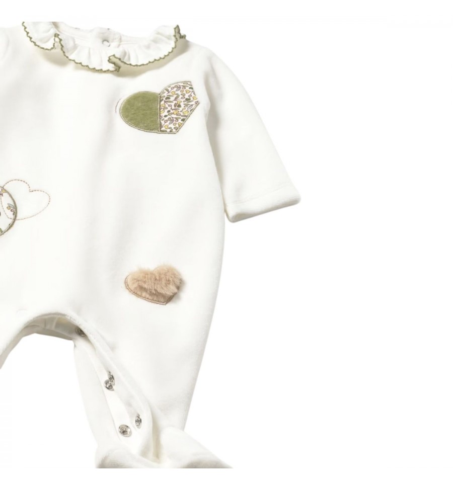 Pijama de manga larga para recién nacida. Cuello bebé. Cierre con botones a presión en la parte posterior. Botones a presión en la entrepierna para facilitar la puesta de la prenda. Elementos de adorno: aplique decorativo, bordado.