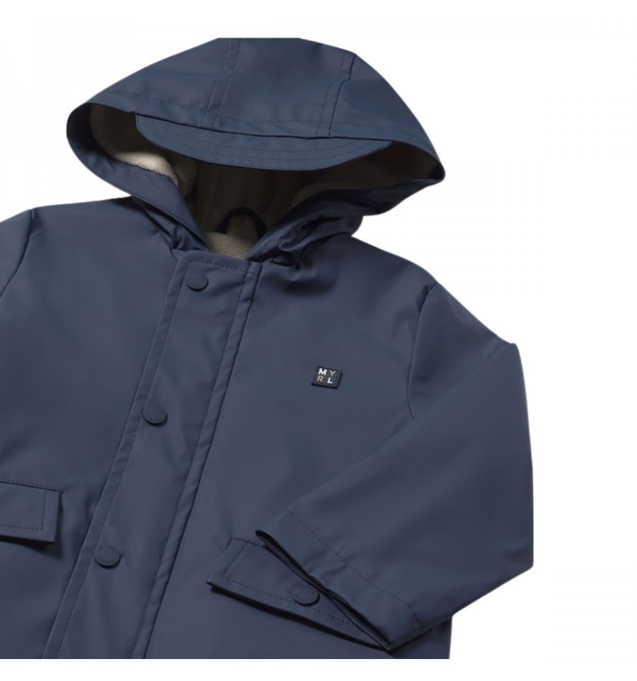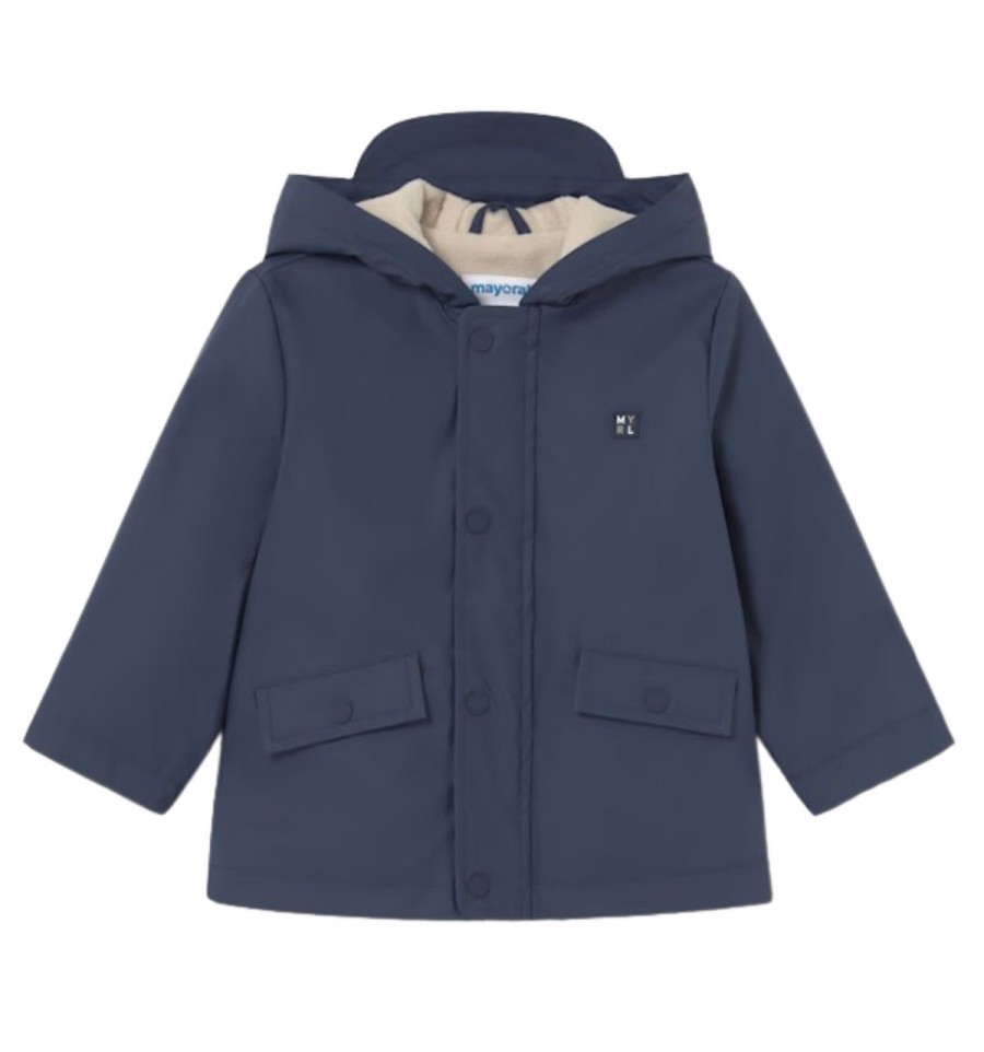 Chaqueta impermeable, forrada en fleece. Capucha con visera. Cierre con cremallera y botones. Suave forro interior de poliéster. Bolsillos funcionales en la parte delantera.